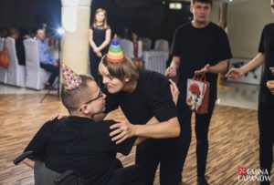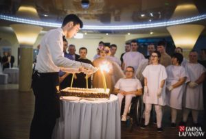 Bezpośrednio po drugim występie naszych podopiecznych na salę wjechał tort – prezent od naszych sponsorów. Wszyscy uroczyście odśpiewali „Sto lat”, po czym pierwszy kawałek tortu ukroiła Dyrektor PCPR-u Elżbieta Paczyńska.