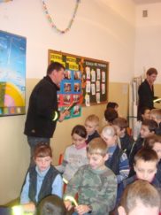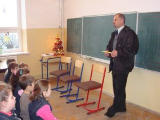 Kierownik posterunku Janusz Stopa, podczas krótkiej pogadanki mówił o zagrożeniach, na które narażeni są piesi, jeśli nie są odpowiednio oznakowani.