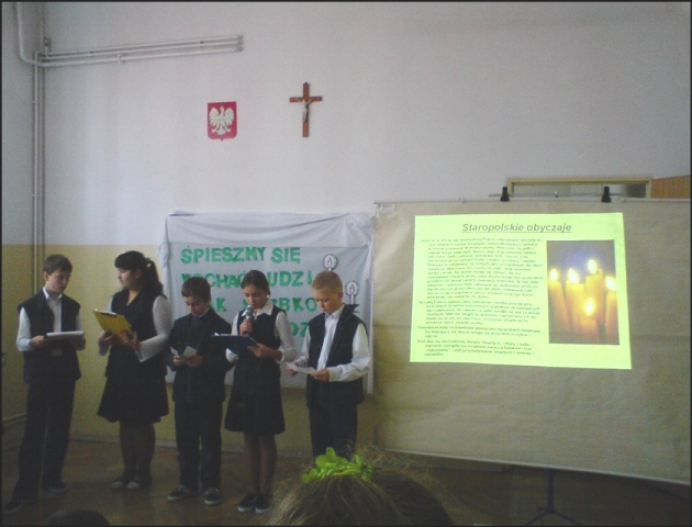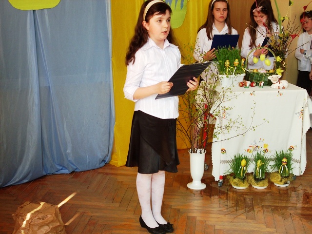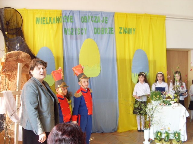 8 kwietnia w naszej szkole przeżyliśmy pod wpływem programu artystycznego niezwykłą atmosferę Świąt Wielkiej Nocy. Na program ów złożyła się religijna inscenizacja „Przy Grobie Chrystusa” oraz wiersze i piosenki ukazujące tradycje i zwyczaje wielkanocne, które opatrzone zostały hasłem „Wielkanocne obyczaje wszyscy dobrze znamy”.