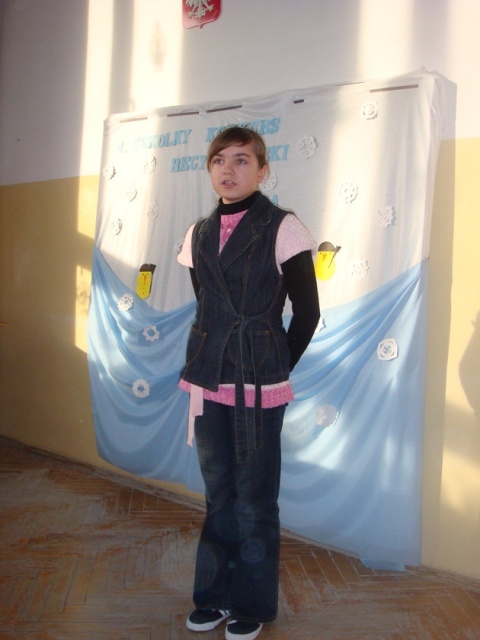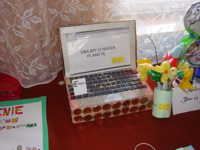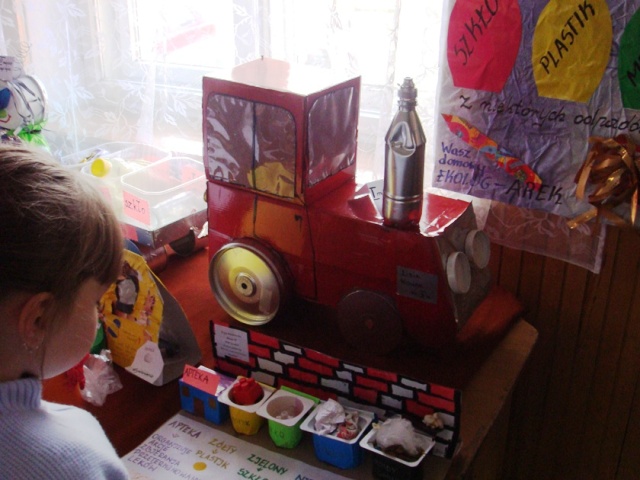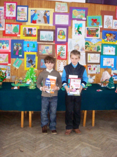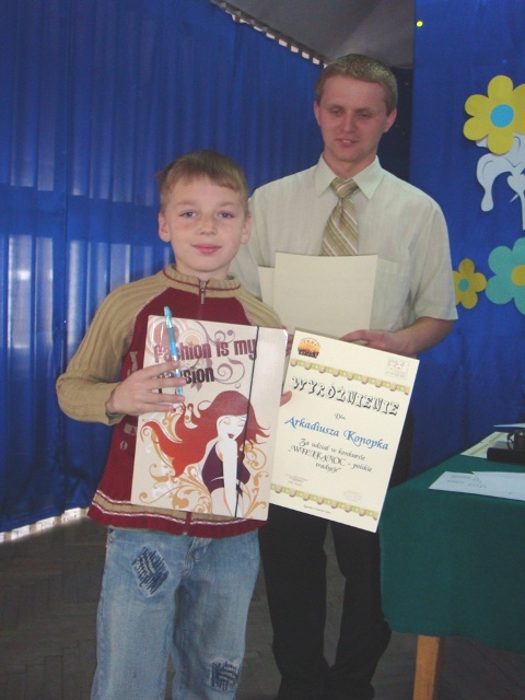 1 miejsce – Konopka Arkadiusz – kl. III, 3 miejsce – Stokłosa Sylwia – kl. III, wyróżnienie – Klejdysz Aleksandra -kl. II – za wykonanie zaproszenia dla rodziców mówiącego o segregacji śmieci pod hasłem „Baw się z nami kolorowymi odpadami”,