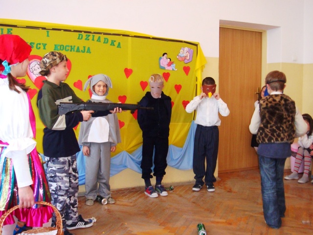 Na koniec klasa III przedstawiła pouczającą scenkę pt: „Czerwony Kapturek”, w której z troską prosili swoich dziadków, aby dbali o swoje zdrowie. Występy zakończono gromkim odśpiewaniem „Sto lat”, a później wnuczęta wręczyły swoim Babciom i Dziadziusiom własnoręcznie wykonane upominki i laurki. Na koniec wszyscy zasiedli do wspólnego stołu i z apetytem „pałaszowali” słodkie niespodzianki.