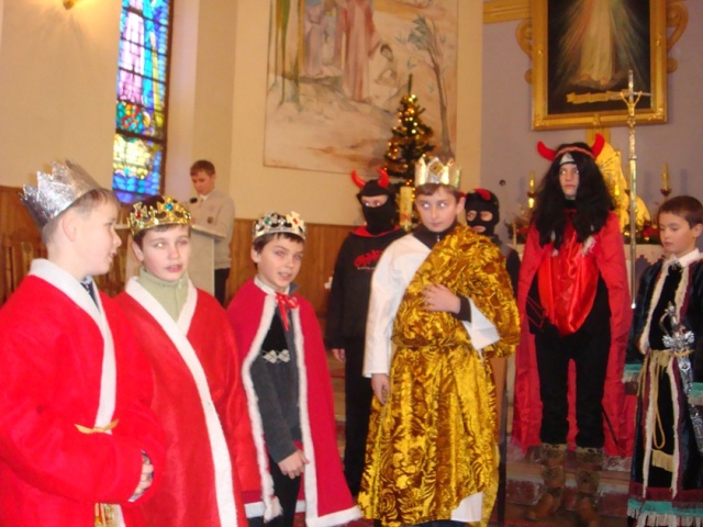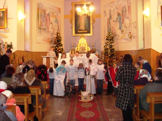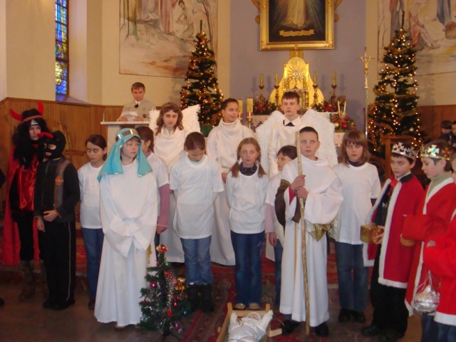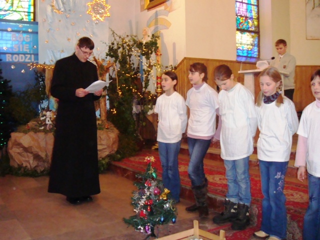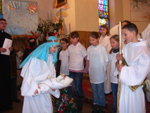 Ksiądz katecheta mgr Krzysztof Kamieński oraz uczniowie z klas IV – VI przygotowali jasełka, które zostały wystawione w naszym kościele w niedzielę 1 lutego. Dzięki temu nie tylko pozostali uczniowie, ale i wszyscy mieszkańcy wsi mogli na nowo przeżyć świąteczną atmosferę, a przy okazji podziwiać aktorski kunszt naszych uczniów i piękną interpretację tradycyjnych kolęd i pastorałek. Wszyscy zwrócili tez uwagę na ich przepiękne stroje.