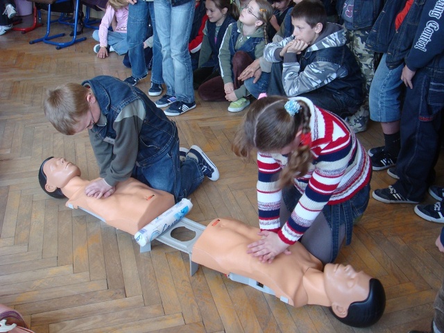15 kwietnia uczniowie klas I – VI mieli możliwość poznania zasad udzielania pierwszej pomocy pod kierunkiem fachowców. Wszyscy uczniowie na fantomach ćwiczyli „sztuczne oddychanie”, a z pomocą kolegów służących za modele uczyli się poprawnie opatrywać rany.