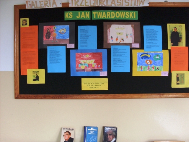 Klasa II ( z p. Ewą Bohacz) wykonała gazetkę przybliżającą postać ks. Jana Twardowskiego, podobnie – klasa III (z p. Marią Statek). Klasa IV ( z p. Agatą Kobyłko) i klasa V ( z p. Agnieszką Maj) zaprezentowała twórczy dorobek Jana Matejki, a klasa VI (z p. Agatą Statek) ukazała na tle historycznym sylwetkę Jana Henryka Dąbrowskiego. Gazetki te z pewnością były pomocne w wyborze odpowiedniego patrona dla naszej placówki.