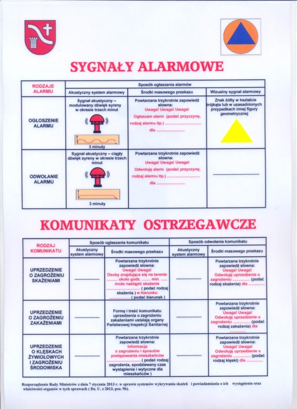 Syreny uruchomione zostaną zgodnie z § 10 ust. 3 i 4 rozporządzenia Rady Ministrów z dnia 7 stycznia 2013 r. w sprawie systemów wykrywania skażeń i powiadamiania o ich wystąpieniu oraz właściwości organów w tych sprawach (Dz. U. z 2013 r. poz. 96).