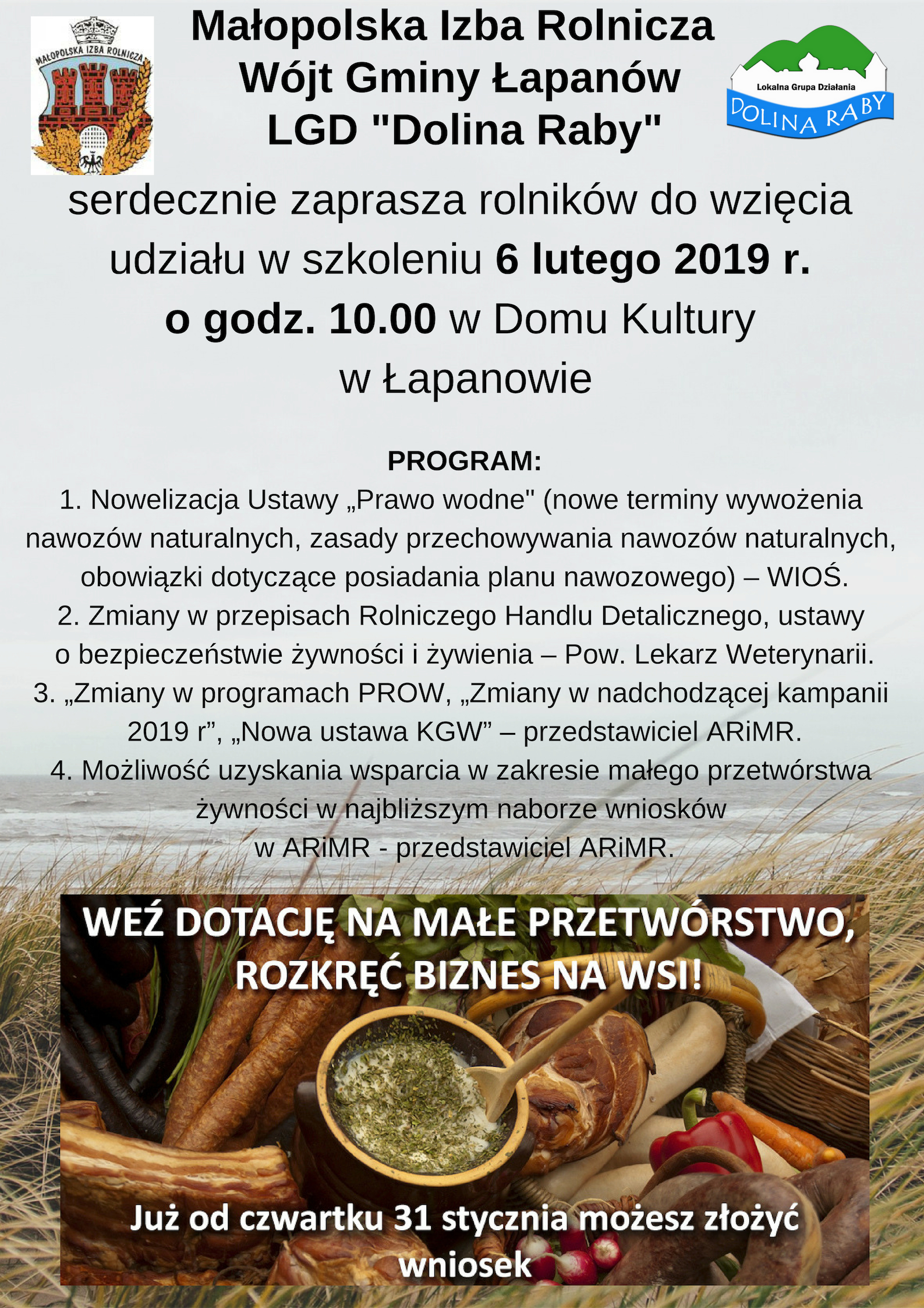 Małopolska Izba Rolnicza zaprasza Rolników z Powiatu Bocheńskiego do wzięcia udziału w szkoleniu w dniu 6 lutego 2019 r. o godz.: 10:00 w miejscowości Łapanów w budynku Centrum Kultury.