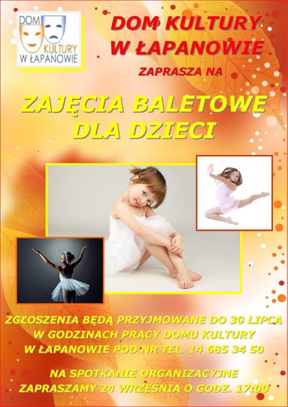 Dom Kultury w Łapanowie zaprasza na zajęcia baletowe dla dzieci od 4. roku życia. Na lekcji wasze pociechy nauczą się podstaw tańca klasycznego poprzez zabawę w miłej atmosferze. Zajęcia odbywać się będą w dwóch grupach wiekowych: